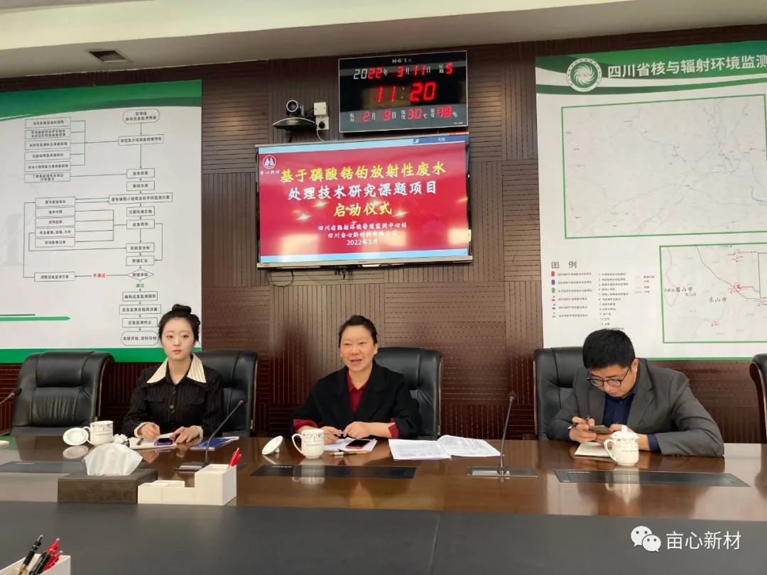2022年3月11日,基于磷酸鋯的放射性廢水處理技術(shù)研究課題項(xiàng)目啟動(dòng)儀式在四川省輻射環(huán)境管理監(jiān)測(cè)中心站(以下簡(jiǎn)稱省輻射站)隆重舉行。省輻射站黨委書(shū)記、站長(zhǎng)鄧曉欽,畝心新材董事長(zhǎng)魏官惠出席啟動(dòng)儀式。